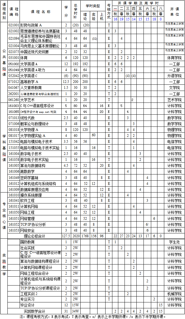 2.学位课程:马克思主义基本原理、大学英语、高等数学、CC++语言程序设计、算法与数据结构、电路与模拟电子技术、数字电子技术、数据库原理及应用、操作系统原理、计算机组成与系统结构、TCP/IP协议分析、计算机网络、网络工程、网络管理、网络安全、软件工程。