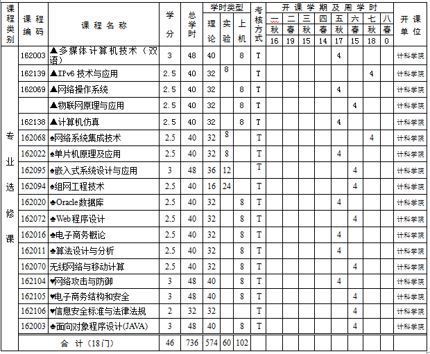 选修课(包括专业选修课和公共选修课)须修满29学分。学生应在下列专业选修课程中修满19学分,其中 表示限制性选修课程表示网络应用(偏硬件方向)选修课表示网络应用(偏WEB应用方向)选修课表示网络安全方向选修课表示图形图像与多媒体技术方向选修课。公共选修课的设置由学校提供。