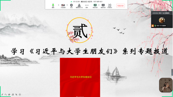 此次团会以线上形式,组织同学们学习“百生讲坛”省级优秀主讲人和活力团支的相关材料;观看《中国青年报》刊发的《习近平与大学生朋友们》系列专题报道,并展开以“我为什么入党?”为主题的研讨,让同学们领会和学习贯彻习近平新时代中国特色社会主义思想,引发同学们对入党的思考和自我探寻入党的初心。最后主持人宣读“百生讲坛”赛事规则,并鼓励同学们积极报名参加。
