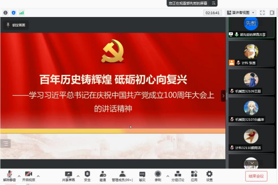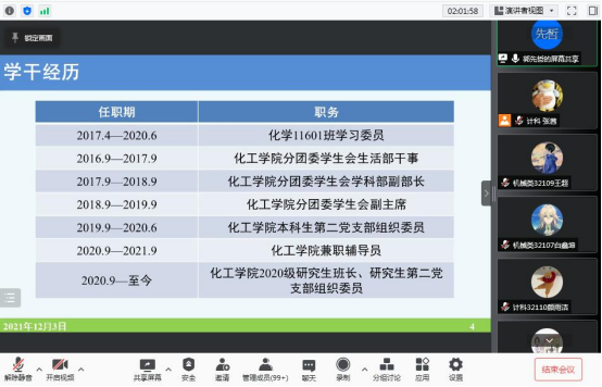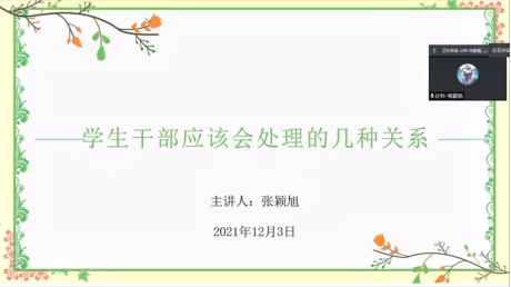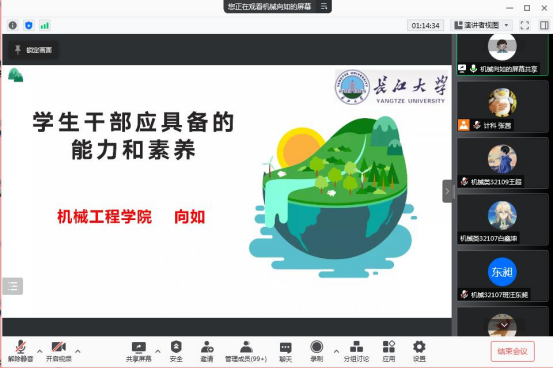 辅导员张颖旭、张茜,机械工程学院辅导员向如及化学工程学院兼职辅导员郭先哲主讲,各学院21级主要学生干部共同参加。