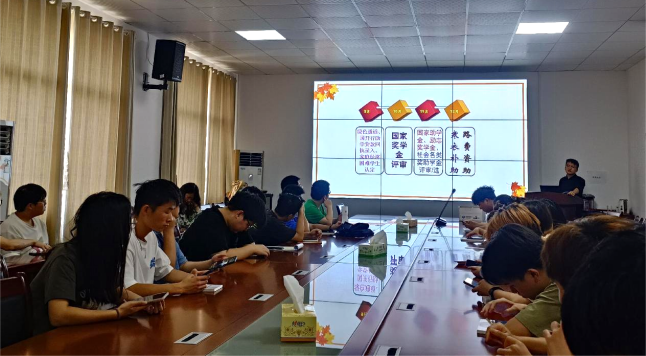 的奖助学金体系。然后,张颖旭老师详细介绍了学院开展中的各项奖助学金工作。其中,重点介绍了国开行助学贷款。他强调,如果贷款申请者能够顺利毕业,就要及时还清助学贷款,一直拖延还款,将会影响个人征信。接着,张颖旭老师依照时间顺序介绍了下个学年即将开展的各项资助工作,分别有:九月的绿色通道、国开行助学贷款回执录入、家庭经济困难学生认定,十月的国家奖学金评审,十一月的国家助学金、励志奖学金,社会各类奖助学金评审/选,以及十二月的寒衣补助、路费补助。他指出,上述工作是即将开展的重点工作。他督促各位学生干部团结协作,落实资助工作的各项措施,将各项补助真正惠及有需要的同学。