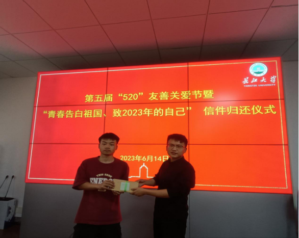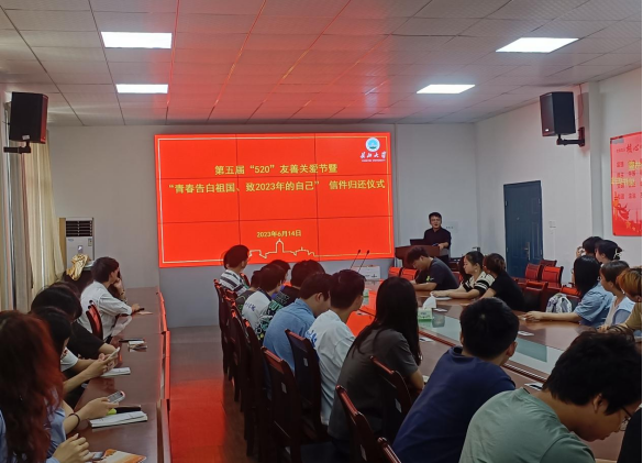于在5教501会议室举行第五届“520”友善关爱节暨“青春告白祖国,致2023年的自己”信件归还仪式。学院2021级辅导员张颖旭、兼职辅导员吴倩以及学院2021级全体班委共同参加。
