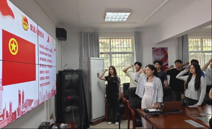 活动伊始,在团支书那诗悦的带领下,全体成员起立,高举右拳,齐声重温入团誓词。铿锵有力的誓言在活动现场回荡,瞬间唤醒了团员们入团时的初心与使命,为整场活动奠定了庄严而坚定的基调。