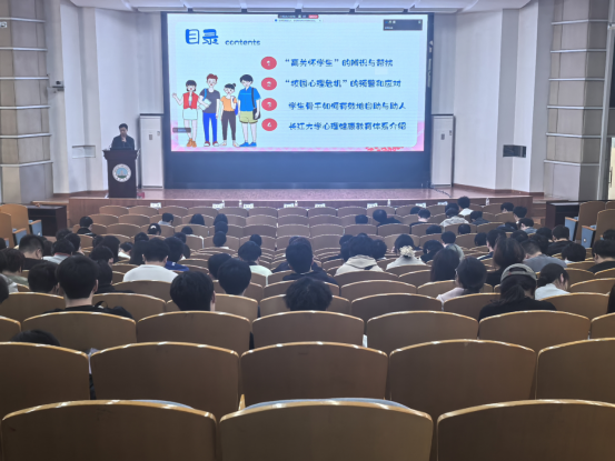 四级心理危机干预体系和学生心理健康教育中心,给同学们展示学生心理健康教育中心的实景,让同学们牢记24小时生命热线,了解心理中心的服务项目和咨询项目,并且要求参会学生干部会后及时传达此次培训会相关内容。