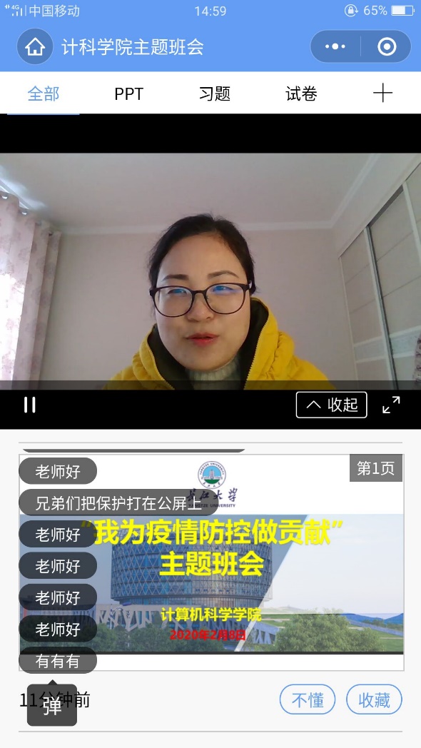 在新冠肺炎疫情防控期间,为落实学校防控指挥部的各项工作要求,确保每一名学生不因疫情影响学业,2月8日下午15:00,学院利用“雨课堂”召开了全院学生大会,学院党委副书记颜学俊、全体辅导员、部分班主任、2000余名研究生、本科生参加大会。大会由院团委书记苏玉容主讲。