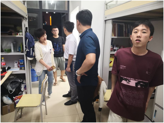 院长崔艳荣、副院长宋文广、学院党委副书记颜学俊、研究生辅导员付盈主任走访2019级全体硕士研究生的学生宿舍,深入了解他们的思想、学习、生活、安全、卫生等情况。