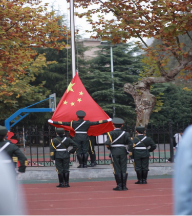 升旗仪式第一项:升国旗,奏唱国歌,全体师生行注目礼。伴随着秋风,国旗护卫队迈着铿锵的步伐来到了国旗台下,全场一片肃静。庄严的国歌响起,鲜艳的五星红旗徐徐展开,冉冉升起。在场的师生纷纷仰起头,满怀崇敬之情向国旗行注目礼,表达对祖国的崇高敬意。