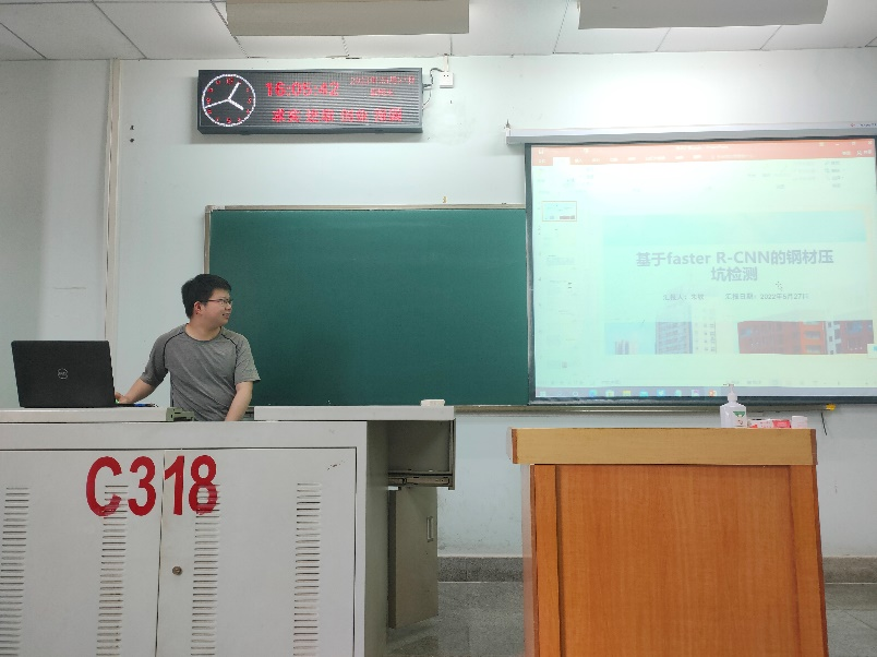 朱钦同学报告的主要内容为通过Faster RCNN网络结构,实现了从端到端的钢材压坑检测,避免在工业生产中出现钢材不合格问题。但是使用Faster RCNN网络结构,实现的准确率和速度还略有不足,后续会通过YOLO算法来继续对准确率和速度进行改进。