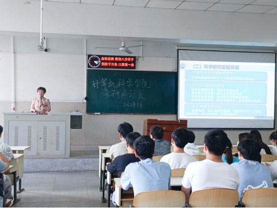 于2022年9月14日下午4点在东校区12教104教室举行了考研再动员大会,出席本次会议的有计算机学院院长崔艳荣、党委副书记颜学俊以及2019级全体考研同学,会议线上线下同步进行。