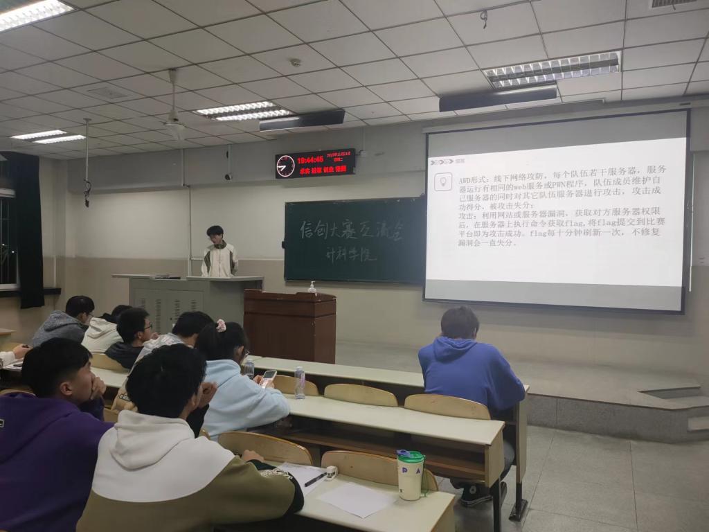 物联12001班肖雄主要从竞赛背景、赛道选择、个人经验、成长收获四个方面进行了分享。他强调同学们要根据自己的兴趣和能力选择适合自己的赛道,提前准备,多看备赛视频多敲代码。计研20级熊彬则从网络安全赛道出发,详细讲解了网安赛道初赛、复赛比赛的主要内容和具体如何进行备赛。在两个同学分享完毕后,与会同学积极提问,会议现场交流热烈。
