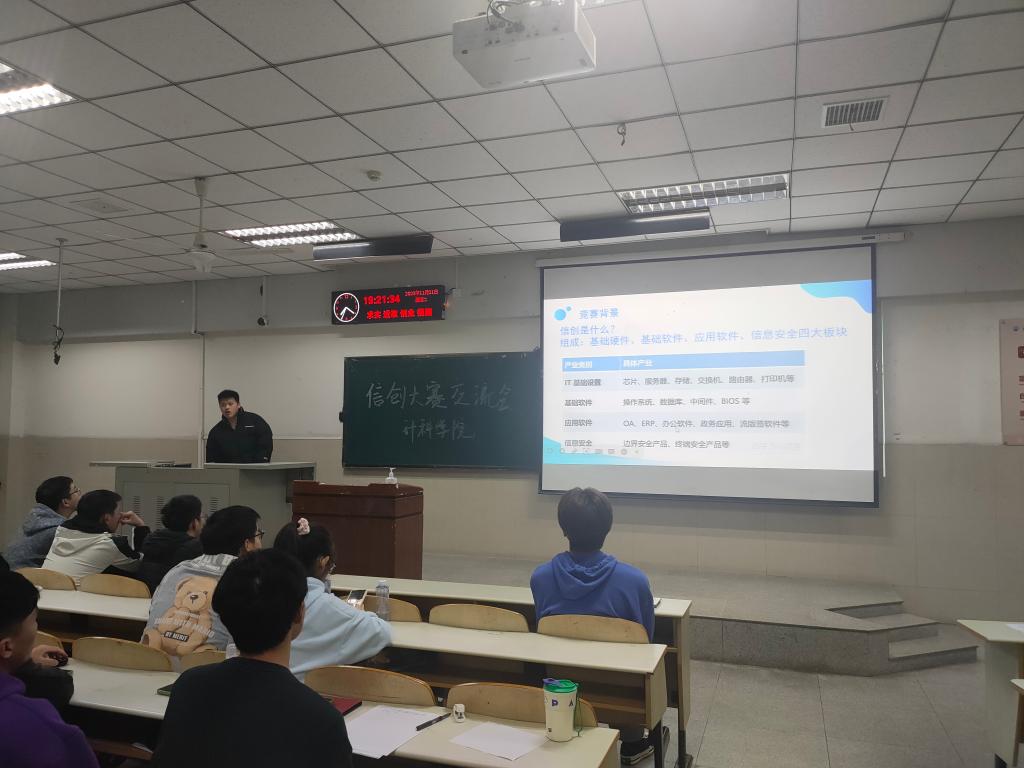 学院副院长陈中举为同学们详细介绍了湖北省大学生信创大赛的目的、主要内容、组织机构、参赛要求和比赛制度及安排。他鼓励同学们积极参与学科竞赛,以赛促学、以赛促创,提高自身信息技术创新能力。