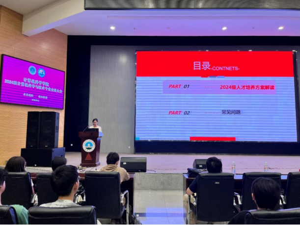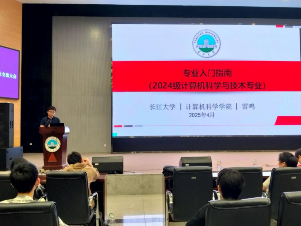 院长崔艳荣,院长助理兼计算机科学与技术系主任雷鸣,副主任张凯、代江华,新引进的博士后张玉繁,学工办老师蒋代运,为2024级计科专业全体230名同学介绍专业发展与成长规划,会议由雷鸣老师主持。