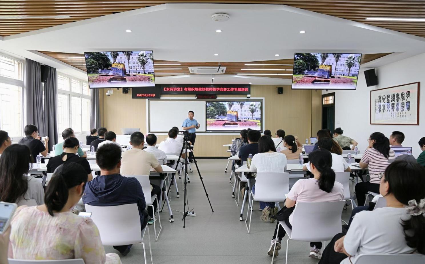 教师教学竞赛的工作思路与具体举措。培训现场互动频繁,参训教师围绕“竞赛选题技巧”“教学方案设计优化”“课堂展示细节把控”等问题积极提问,郑健逐一耐心解答,培训反响热烈,获得参训教师一致认可。