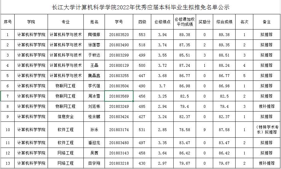 2022届优秀本科毕业生推荐免试攻读硕士学位研究生结果予以公布。