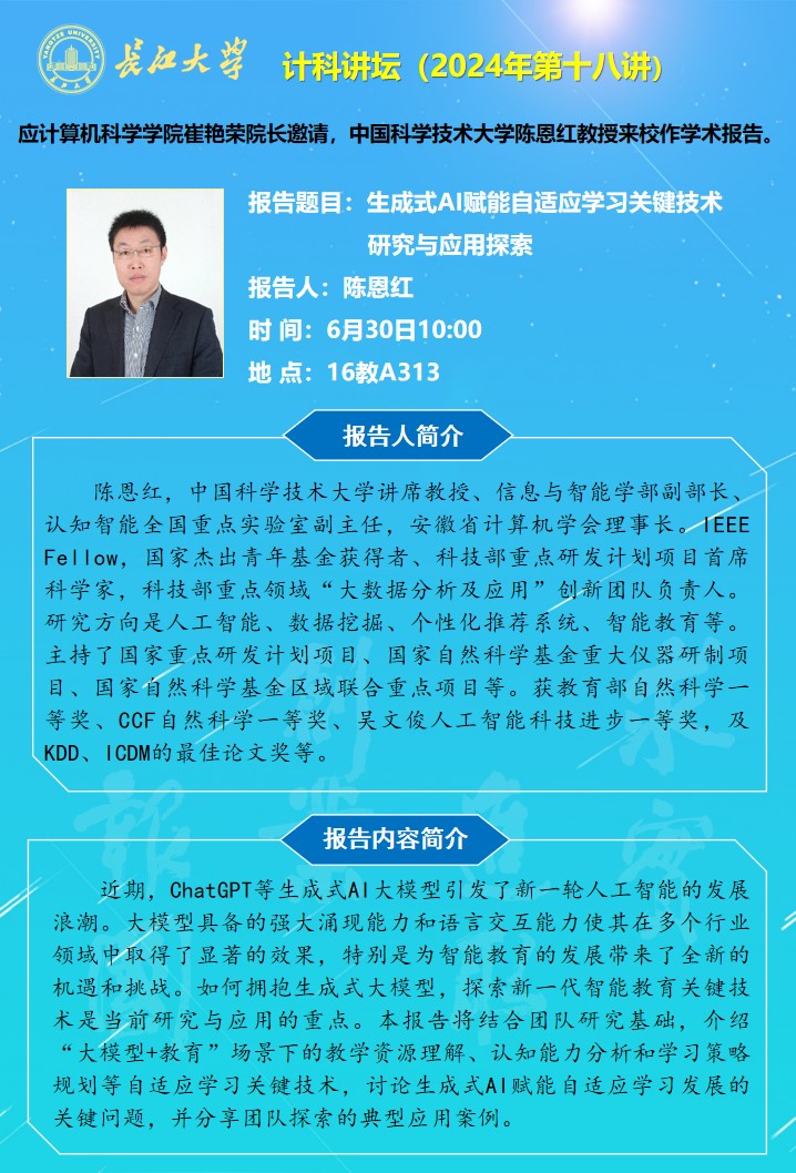 计科讲坛(2024年第十八讲):生成式AI赋能自适应学习关键技术研究与应用探索