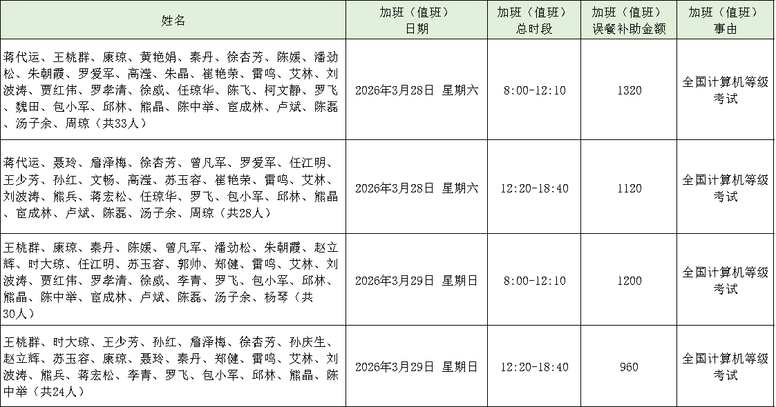 2026年3月全国计算机等级考试工作加班(值班)误餐情况公示