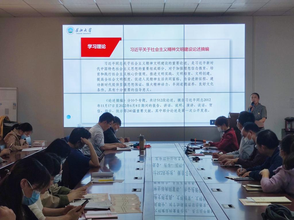 黄书记带领大家一起学习了《习近平关于社会主义精神文明建设论述摘编》部分内容,并布置后续学院将采用每日微信群分享方式继续学习,以不断加强理想信念教育、培育和践行社会主义核心价值观,为奋进新征程、建功新时代提供坚强思想保证和强大精神动力。